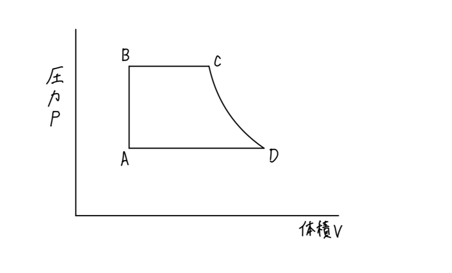 また、理想は断熱(熱の出入りなし)で圧力上昇。 - B→C:ボイラで加熱