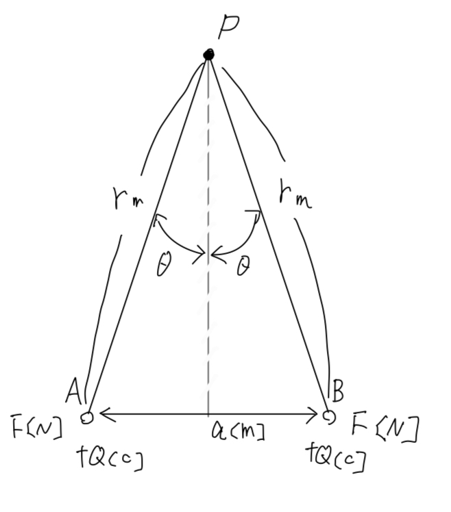 真空中において、それぞれ質量m[kg]、電荷+Q[C]の小さな球の帯電体A及びBがある。これらの帯電体をそれぞれ長さr[m]の糸で点Pからつるしたところ、図のように、帯電体A,Bの間隔がa[m]となって静止した。次の(a)及び(b)に答えよ。ただし、真空の誘電率はε0[F/m]、重力加速度はg[m/s²]とする。また、帯電体A及びBの直径はr[m]に比べて十分に小さく、糸の質量は無視できるものとする。