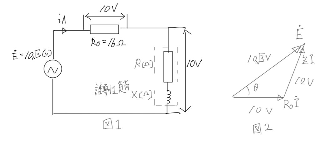 図1のように、抵抗R0=16[Ω]、インピーダンスZ[Ω]の誘導性負荷(抵抗R[Ω]、誘導性リアクタンスX[Ω])を直列に接続した交流回路がある。正弦波交流電圧E=10√3[V]の電源をこの回路に接続したところ、R0の端子間電圧の大きさ、誘導性負荷の端子間電圧の大きさは、それぞれ10[V]であった。次の(a)及び(b)に答えよ。