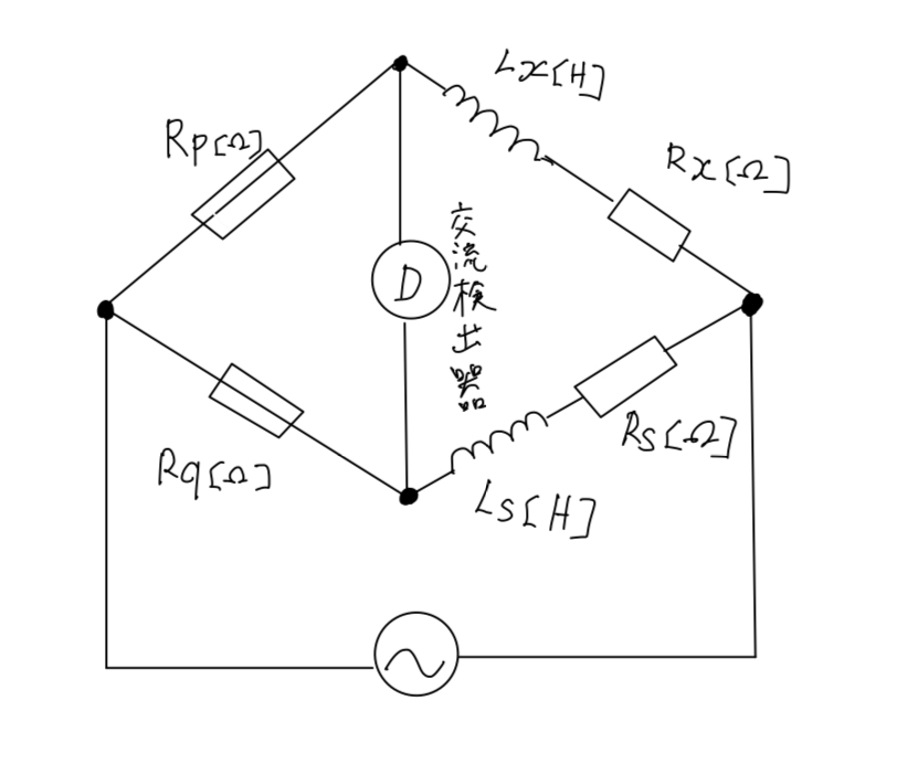 図は、破線で囲んだ未知のコイルのインダクタンスLx[H]と抵抗Rx[Ω]を測定するために使用する交流ブリッジ(マクスウェルブリッジ)の等価回路である。このブリッジが平衡した場合のインダクタンスLx[H]と抵抗Rx[Ω]の値として、正しいものを組み合わせたのは次のうちどれか。ただし、交流ブリッジが平衡したときの抵抗器の値はRp[Ω]、Rq[Ω]、標準コイルのインダクタンスと抵抗の値はそれぞれLs[H]、Rs[Ω]とする。