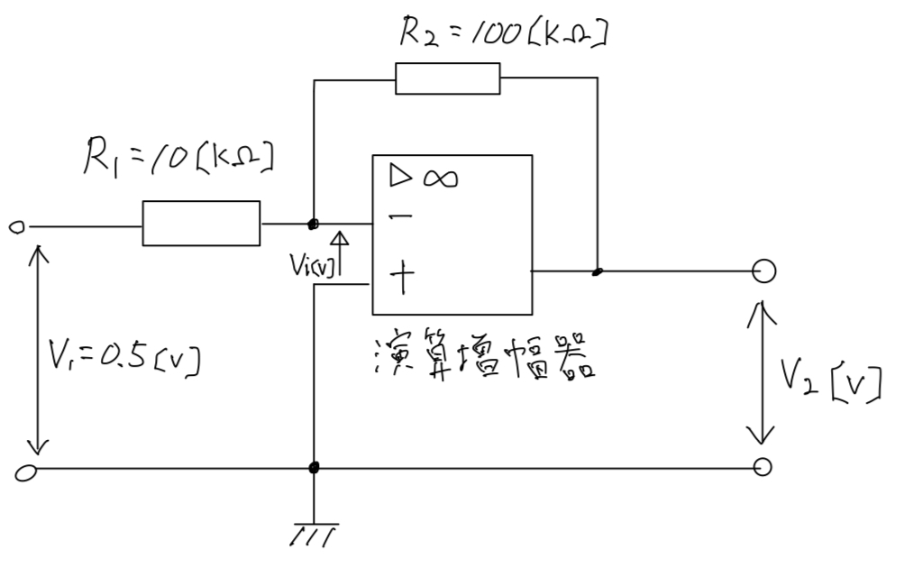図のような演算増幅器を使用した直流回路において、抵抗R1=10[kΩ]、抵抗R2=100[kΩ]である。この回路に入力電圧V1=0.5[V]を加えたとき、次の(a)及び(b)に答えよ。ただし、演算増幅器は理想的な特性を持ち、その入力抵抗及び電圧増幅度は極めて大きく、その出力抵抗は無視できるものとする。