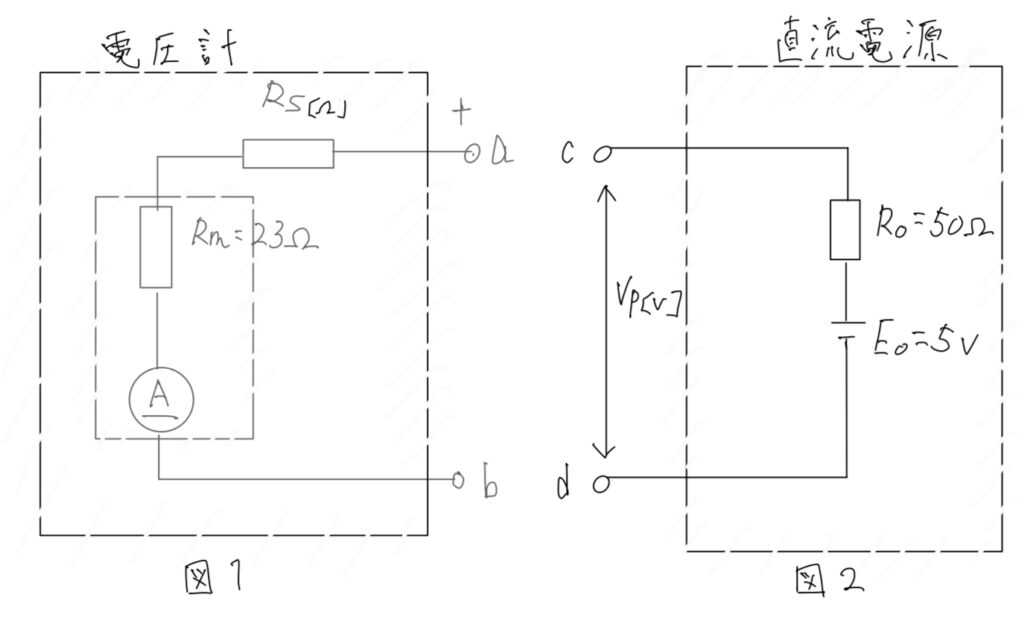 (b) 図2のような電圧E0=5[V]、内部抵抗R0=50[Ω]の直流電源の端子c,dに、この電圧計の端子a,bをそれぞれ接続し、電圧Vp[V]を測定した。電圧計が指示したVp[V]の値として、最も近いのは次のうちどれか。