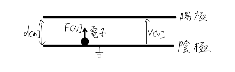 図のように、真空中に電極間隔 d[m] の平行板電極があり、陰極板上に電子を置いた。陽極板に電圧 V[V] を加えたとき、この電子に加わる力 F[N] の式として、正しいのは次のうちどれか。ただし、電子の質量を m[kg]、電荷の絶対値を e[C] とする。また、電極板の端効果は無視できるものとする。