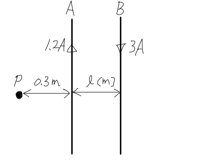 図のように、A、B 2本の平行な直線導体があり、導体Aには 1.2 [A] の、導体Bにはそれと反対方向に 3 [A] の電流が流れている。導体AとBの間隔が l [m] のとき、導体Aより 0.3 [m] 離れた点Pにおける合成磁界が零になった。l [m] の値として、正しいのは次のうちどれか。