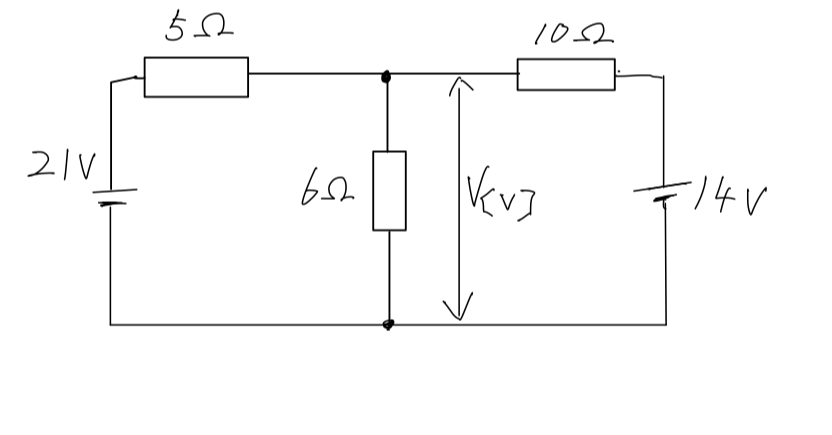 図のような直流回路において、抵抗 6 [Ω] の端子間電圧の大きさ V [V] の値として、正しいのは次のうちどれか。