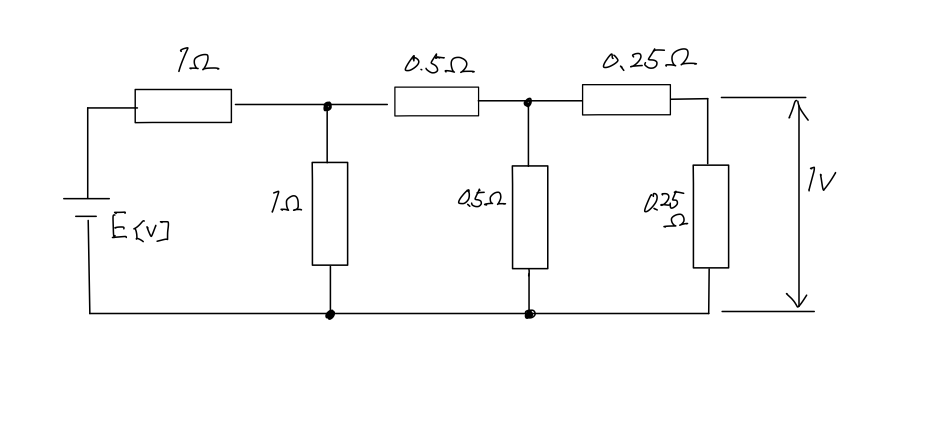 図のような直流回路において、電源電圧が E[V]であったとき、末端の抵抗の端子間電圧の大きさが 1[V]であった。このときの電源電圧 E[V]の値として、正しいのは次のうちどれか。