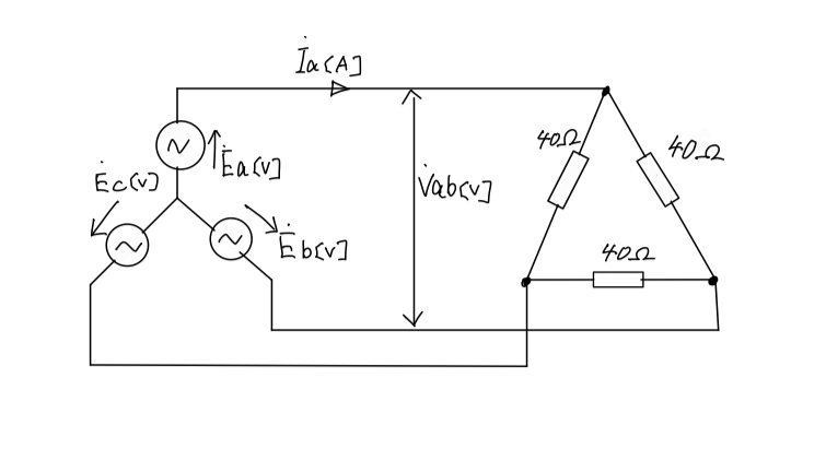 図の対称三相交流電源の各相の電圧は,それぞれ Ea=200∠0[V],Eb=200∠−2π/3[V],Ec=200∠−4π/3[V]である。この電源には,抵抗40[Ω]をΔ結線した三相平衡負荷が接続されている。このとき,線間電圧 Vab[V]の大きさと線電流 Ia[A]の大きさ(スカラ量)の組合せとして,最も近いものは次のうちどれか。