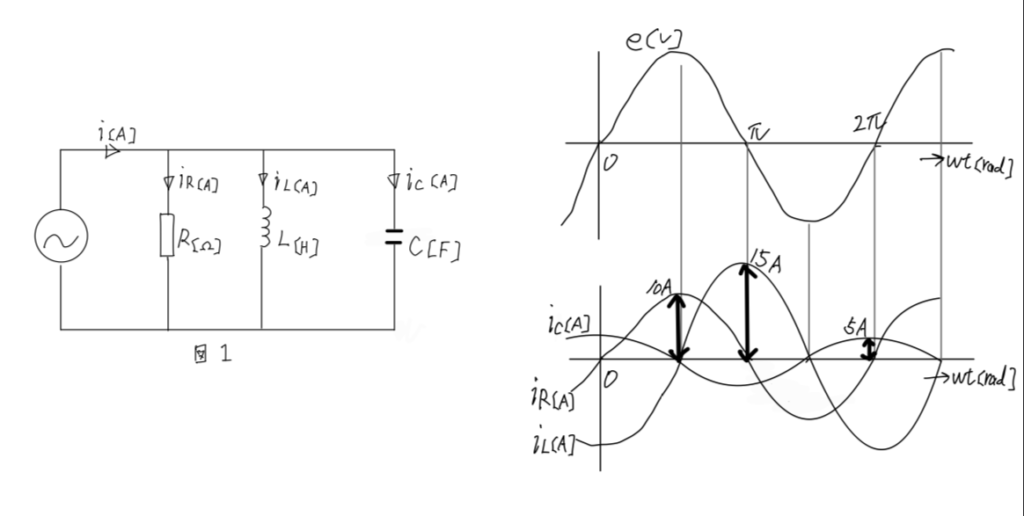 図1のように,R[Ω]の抵抗,インダクタンス L[H]のコイル及び静電容量 C[F]のコンデンサを並列に接続した回路がある。この回路に正弦波交流電圧 e[V]を加えたとき,この回路の各素子に流れる電流 iR[A],iL[A],iC[A]と e[V]の時間変化はそれぞれ図2のようであり,それぞれの電流の波高値は iR=10[A],iL=15[A],iC=5[A]であった。このとき,回路に流れる電流 i[A]の電圧 e[V]に対する位相として正しいのは次のうちどれか。