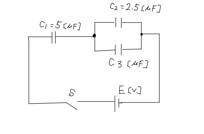 図のように、静電容量 C1、C2 及び C3 のコンデンサが接続されている回路がある。スイッチ S が開いているとき、各コンデンサの電荷は、すべて零であった。スイッチ S を閉じると、C1 = 5 [μF] のコンデンサには 3.5 × 10^-4 [C] の電荷が、C2 = 2.5 [μF] のコンデンサには 0.5 × 10^-4 [C] の電荷が充電された。静電容量 C3 [μF] の値として、正しいのは次のうちどれか。