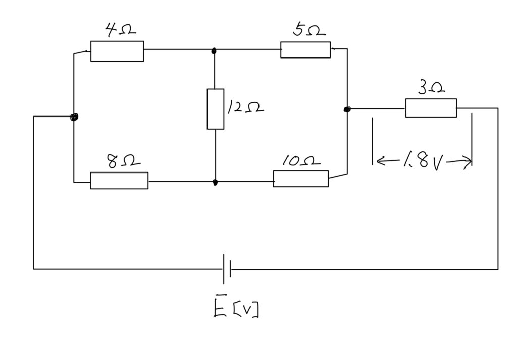 図のような直流回路において、抵抗 3[Ω] の端子間の電圧が 1.8[V] であった。