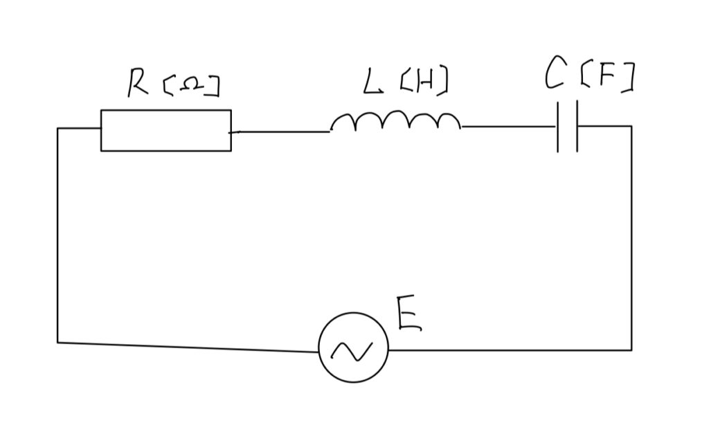 図のように、R[Ω]の抵抗、インダクタンス L[H] のコイル、静電容量 C[F] のコンデンサを直列に接続した交流回路がある。この回路において、電源 E は周波数を変化できるものとする。電源周波数を変化させたところ、2種類の異なる周波数 f1[Hz] と f2[Hz] に対して、この回路の電源から見たインピーダンス[Ω]の大きさは変わらなかった。このときの f1 × f2 の値として、正しいのは次のうちどれか。
