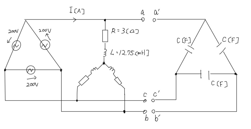 (b) 静電容量 C[F]のコンデンサをΔ結線して接続した。その結果、三相交流電源から見た負荷の力率は 1 になったという。静電容量 C[F]の値として、最も近いのは次のうちどれか。