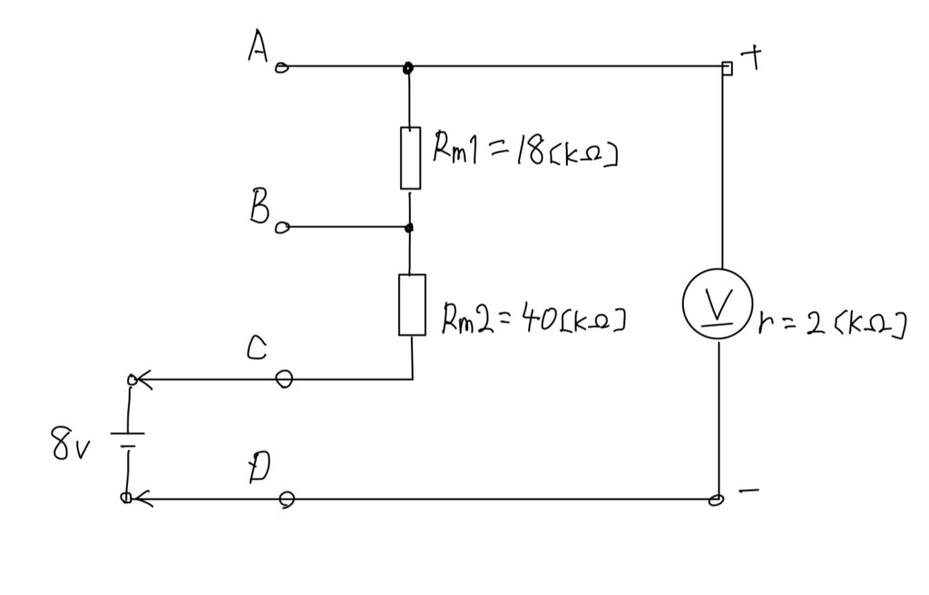 内部抵抗 r=2[kΩ]、最大目盛 1[V]の直流電圧計がある。この電圧計に、RmC=40[kΩ]、RmD=18[kΩ]の抵抗を図のように接続して、測定範囲を拡大した。