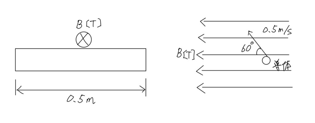 磁束密度 B = 0.02[T] の一様な磁界の中に長さ 0.5[m] の直線状導体が、 磁界の方向と直角に置かれている。