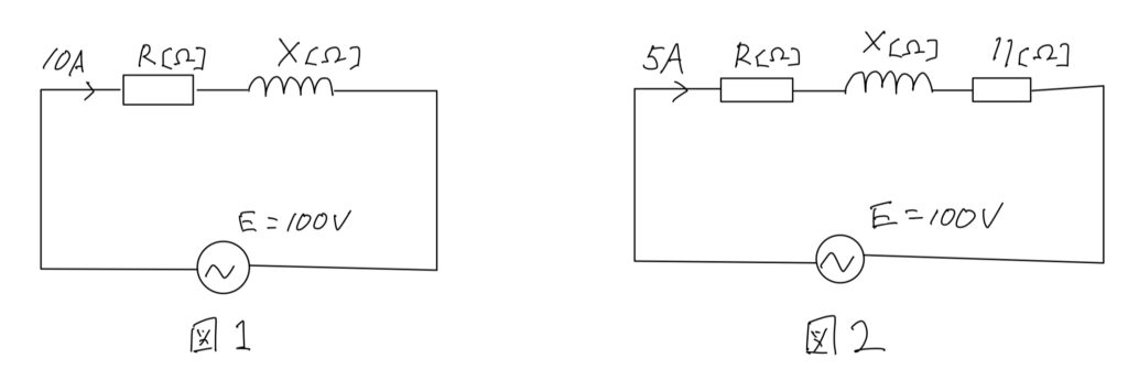 図 1 のような抵抗 R[Ω] と誘導性リアクタンス X[Ω] との直列回路がある。この回路に正弦波交流電圧 E=100[V] を加えたとき、回路に流れる電流は 10[A] であった。この回路に図 2 のように、更に抵抗 11[Ω] を直列接続したところ、回路に流れる電流は 5[A] になった。抵抗 R[Ω] の値として、最も近いのは次のうちどれか。