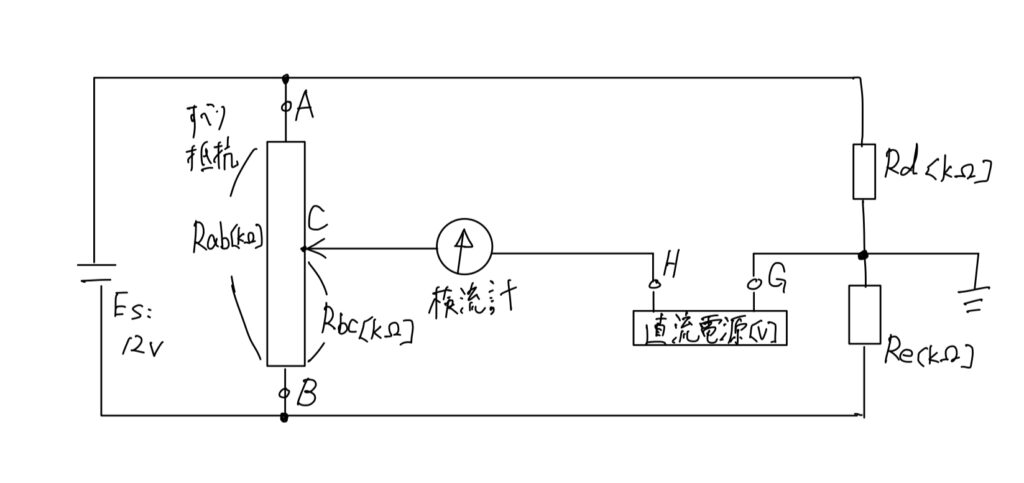 抵抗 Rab[kΩ]のすべり抵抗器、抵抗 Rd[kΩ]、抵抗 Re[kΩ]と直流電圧 Es=12[V]の電源を用いて、未知の直流電圧[V]を測るための回路がある。次の(a)及び(b)に答えよ。