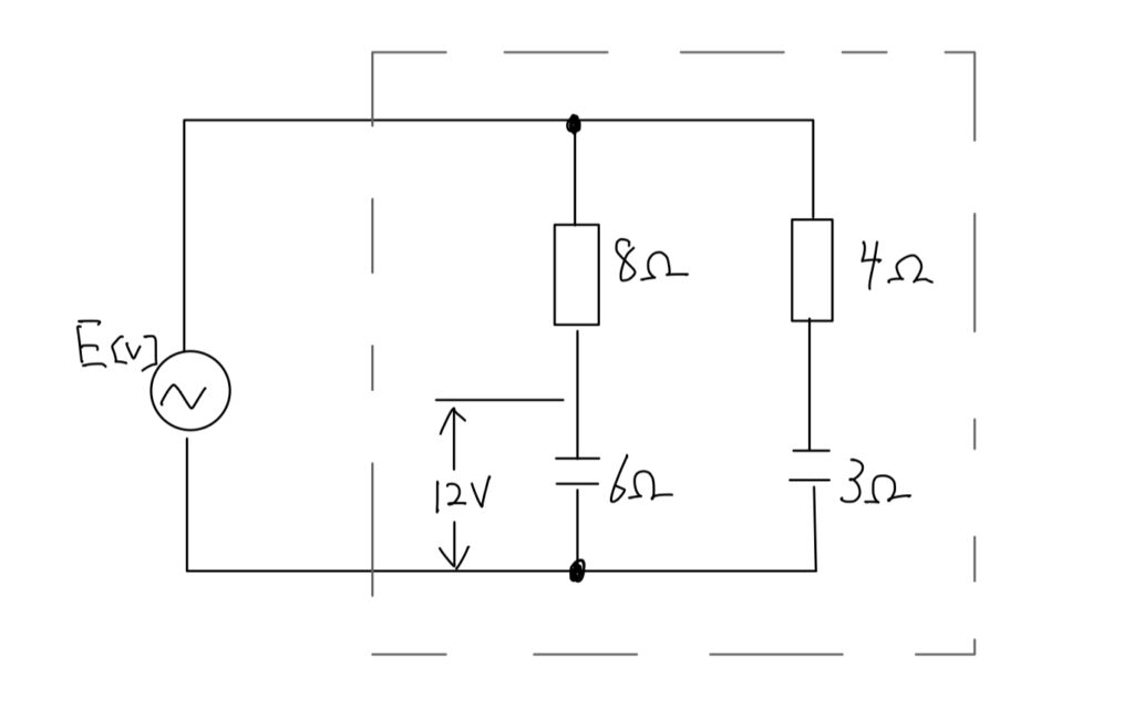 図のような RC 交流回路がある。この回路に正弦波交流電圧 E[V] を加えたとき、容量性リアクタンス 6[Ω] のコンデンサの端子間電圧の大きさは 12[V] であった。このとき、E[V] と図の破線で囲んだ回路で消費される電力 P[W] の値として、正しいものを組み合わせたのは次のうちどれか。