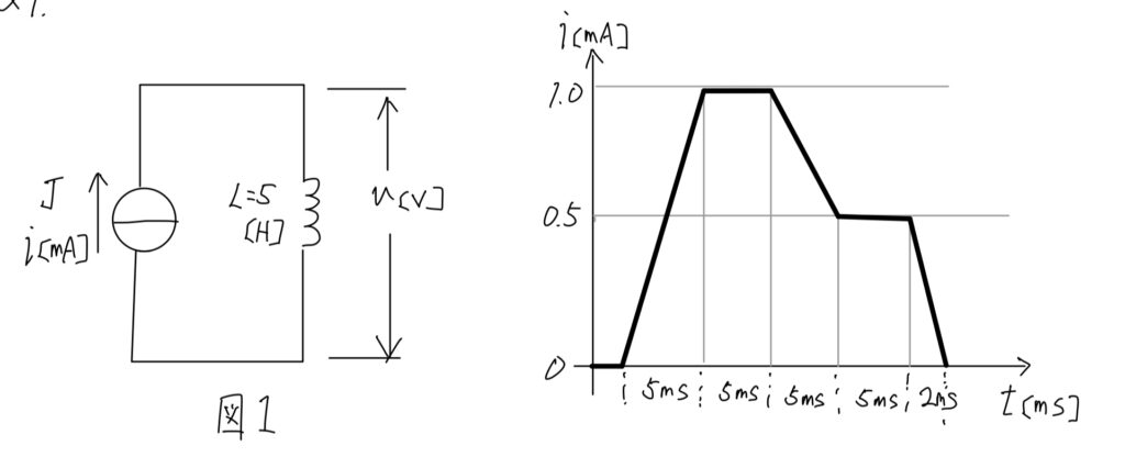 図 1 のように、インダクタンス L=5[H] のコイルに直流電流源 J が電流 i[mA] を供給している回路がある。電流 i[mA] は図 2 のような時間変化をしている。このとき、コイルの端子間に現れる電圧の大きさ |v|[V] の最大値として、正しいのは次のうちどれか。