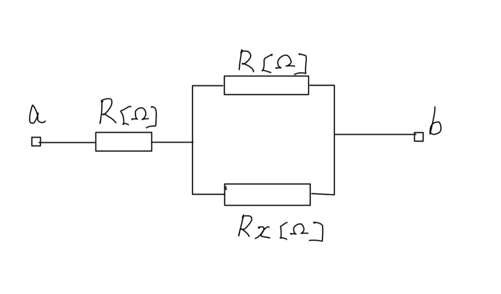 図の抵抗回路において、端子 a、b 間の合成抵抗 Rab[Ω] の値は 1.8R[Ω] であった。